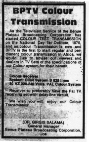 | 04:13, 25 May 2015 | BPTVColour.jpg (file) | 265 KB | Jon Preddle | Nigeria Standard, 1975 ad for colour TV | 1 | |