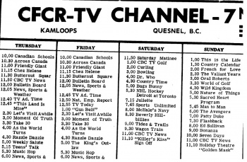 TV listings have been obtained from the newspapers Globe and Mail, Toronto Daily Star, Winnipeg Free Press and CBC Times. The CFCR listings are from the Cariboo Observer. (With grateful thanks to Randy Howell for supplying these.)