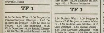 | − | [[File:BelgiumFrance.JPG|right|thumb| | + | [[File:BelgiumFrance.JPG|right|thumb|350px|Doctor Who was available from neighboring countries, such as France; De Voorpost, 21 April 1989]] |
