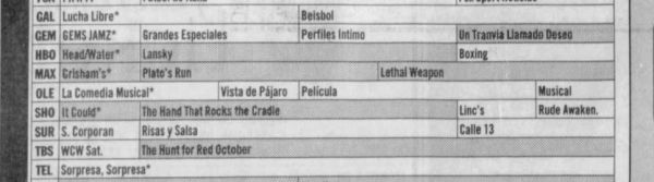 The Spanish language newspaper El Nuevo Herald - which had an edition published in Miami Florida - has listings for OLE, but these only cover 7pm to 11pm so the early morning and late evening screenings of the TV Movie don't appear; also, the paper only uses the generic term "Película" for its "film" listings, so only the 27 February 1999 issue [see clipping above] had an unidentified film from 9pm to 10.30pm that fitted within the above timeslots (adjusted for the US time zones) on that date.
