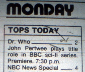 • 5 January 1976: The standard package of Jon Pertwee stories debuted in Boston on Monday 5 January, from 7.30 to 8.00pm. The TOPS TODAY and main billings both name the star as "John Pertwee". The main billing for the first episode also offers rather scathing comments about the quality of the BBC's special effects!