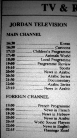 A sample of issues of the English paper ''Jordan Times'' from 1980 to 1984 were examined, but again listings for '''Doctor Who''' could not be located. In 1980, the listings included "descriptions" rather than titles, so billings such as '''"English by television"''' did appear from time to time. In 1982, the listings contained a generic billing for '''"Children's Programme"''' at 5.15pm.