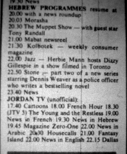 [[File:Jordan Israel.JPG|thumb|right|250px|Generic May 1981 TV Listings from Jerusalem Post, including JORDAN TV (UNOFFICIAL) - Doctor Who not included]]