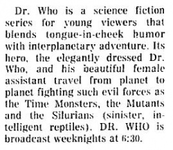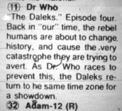 - 29 September 1975: Doctor Who make its series debut in Chicago, screening weekdays at 6.30pm. The first serial to air is The Mutants. Serials continue to air out of order.