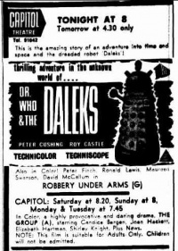 Both Peter Cushing features played in cinemas across the country: for instance, the films opened in theatres in Sydney on 23 December 1965 and 15 December 1967 respectively. The first film played elsewhere, such as in New South Wales and Canberra during 1966.