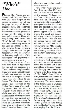 "Dr. Who in America" is a 57 minute documentary for direct-to-video release, produced in late 1983 by Scorpio International Ltd. for the New Jersey Network. The special was hosted by Tom Carroll, and directed by James B. Brandt.