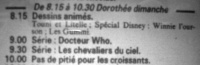 After a very long delay (see the chronology above), the series finally started on Sunday, 19 February 1989, at 9.00am, part of the line-up of CLUB DOROTHÉE DIMANCHE children's programmes. The first serial was Genesis of the Daleks. However, after only a few episodes had gone out, the series was dropped from the CDD line-up.