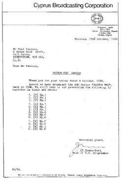 This discovery was announced, with a copy of the letter from the CBC, in the July 1985 issue of Celestial Toyroom, the news-zine of DWAS. At the same time the BBC was sending telexes to foreign TV stations asking for the return of old episodes. Cyprus was apparently the first to respond...