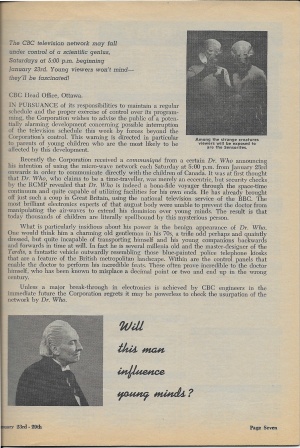 Recently the Corporation received a communiqué from a certain Dr. Who announcing his intention of using the micro-wave network each Saturday at 5:00 p.m. from January 23rd onwards in order to communicate directly with the children of Canada. It was at first thought that Dr. Who, who claims to be a time-traveller, was merely an eccentric, but security checks by the RCMP revealed that Dr. Who is indeed a bona-fide voyager through the space-time continuum and quite capable of utilizing facilities for his own ends. He has already brought off just such a coup in Great Britain, using the national television service of the BBC. The most brilliant electronics experts of that august body were unable to prevent the doctor [sic] from manipulating the air-waves to extend his dominion over young minds. The result is that today thousands of the children are literally spellbound by this mysterious person.