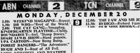 - SYDNEY and CANBERRA: Three days after the PERTH debut, SYDNEY welcomed the new series on Friday, 15 January 1965. The opening run concluded with P4 on Friday, 22 April 1966. K part 6 was broadcast from a Video-Tape copy, since transportation delays over the Christmas period may have meant the film print, which was held in PERTH, might not have been delivered in time. (See Part 2 on the next page for more on the ABC's use of VTR copies…)