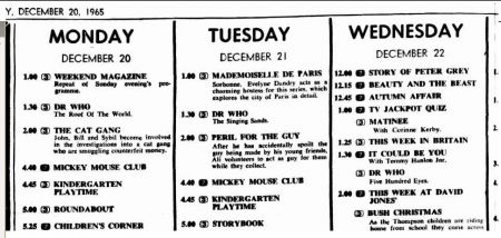- Mid-way through K, the first-ever Australian holiday repeats occurred in SYDNEY -- both D and F were rerun at 1.30pm weekday afternoons, from Monday, 20 December 1965 to Monday, 3 January 1966. (It was during this repeat that a series of Off-Screen Photos were taken -- see below.) Because the film print for F part 3 was required in HOBART, the episode was repeated from a Video-Taped copy.