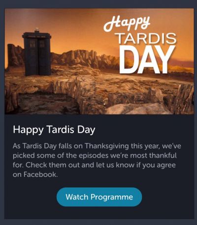 - "Happy TARDIS Day!" - on Thanksgiving Day, 24 November 2017 and to celebrate the programme's own anniversary, BritBox played seven stories they were most "thankful" for (An Unearthly Child, The Enemy of the World, The Time Warrior, Planet of the Spiders, The Caves of Androzani, The Ultimate Foe and Survival)