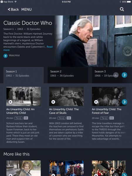 Unusually, the BritBox menu had listings for all the Doctor Who stories in broadcast sequence including those that were missing from the BBC archive and weren't actually available; the screens instead displayed the captions -