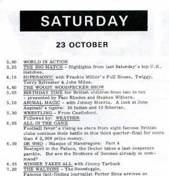 At the weekends, stories were repeated again – Spearhead from Space (all four parts) on Saturday, 19 February starting at 11.25am, then again from 11.10pm, ending early morning Sunday, 20 February. Later that same morning, The Daemons 1 and 2 aired...