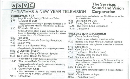 The British Military newspaper Sixth Sense also published TV listings for BFBS-TV in Germany, but no issues of this publication could be accessed. (We did find a source in the UK that had an almost full run of issues for 1979 to 1987, but due to COVID-19 restrictions, we have not yet been able to view these papers. Hopefully, if/when restrictions ease, and public access to the archive can resume, we will follow up with this line of research.)