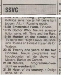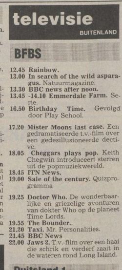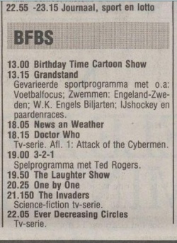 The 1980s West Germany listings come from the Dutch newspaper Limburgsch Dagblad (Limburg Daily), which is available online. Limburgsch was only permitted by the SSVC to include listings for BFBS from 27 August 1982 onwards -- too late for Season 19. While the text was in Dutch and could be easily translated, some of the listing details and story titles were actually in English.