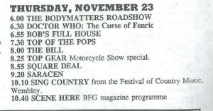 BFBS-TV weekly listings from Berlin Observer, 23 November 1988, showing "Dr Who" on at 7.20pm, Thursday 24 Nov and 1 Dec; and Children's SSVC weekday afternoons)