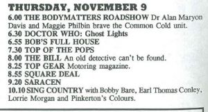 The next available Island listing for Doctor Who is on Thursday, 11 November 1989. This newspaper finally gave a story title: "Ghost Lights" [sic], at 6.30pm. Only three further papers were available, and each of them had a story title: 23 November and 7 December 1989 both had "The Curse of Fenric", and 21 December 1989 said "Survival New" [sic], which has to be part 1.