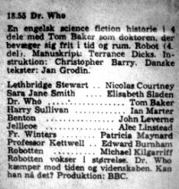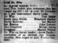 Although the above article, and those below, feature photographs of Louise Jameson (Leela), Mary Tamm (Romana) and K9, none of their stories screened in Denmark. The Doctor is cited as being a superman on the run from the evil Time Lords.