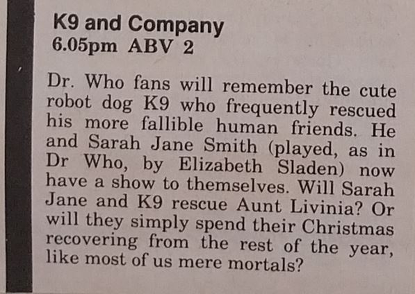 | current | 00:31, 17 December 2024 | 597 × 424 (51 KB) | Jon Preddle (talk | contribs) | Australian listing (paper NK) for K9 & Co Dec 1984 |
