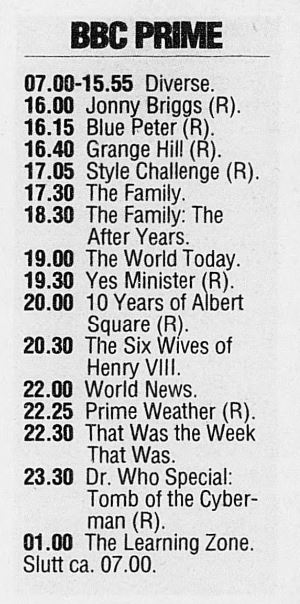 current21:58, 3 May 2021Thumbnail for version as of 21:58, 3 May 2021300 × 604 (57 KB)Jon Preddle (talk | contribs)BBC Prime listing from Norwegian paper; 8 Nov 1996