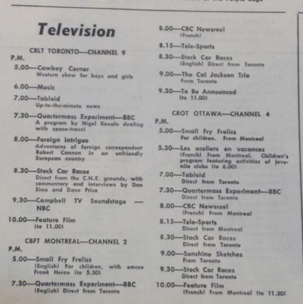 current02:55, 18 May 2019Thumbnail for version as of 02:55, 18 May 2019641 × 643 (59 KB)Jon Preddle (talk | contribs)CBC Times TV listings for 31 July 1953 (issue date 17 July 1953)