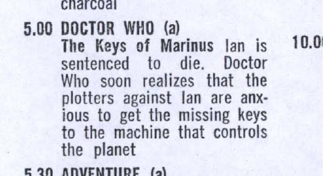 current22:19, 2 April 2015Thumbnail for version as of 22:19, 2 April 2015478 × 256 (44 KB)Jon Preddle (talk | contribs)Listing for Keys of Marinus ep 6 in CBC Times