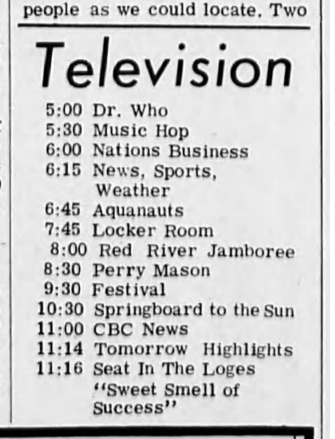 current23:23, 2 April 2015Thumbnail for version as of 23:23, 2 April 2015478 × 626 (86 KB)Jon Preddle (talk | contribs)Generic TV listing Prince George Citizen 1965