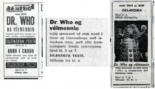 Listings for Peter Cushing movies in Iceland (from http://timarit.is/search_init.jsp?q=%22dr+who%22&lang=is&advanced=&pubId=-1&date_from=01.01.1960&date_to=31.12.1969&orderby=score&start=20&more=0)
