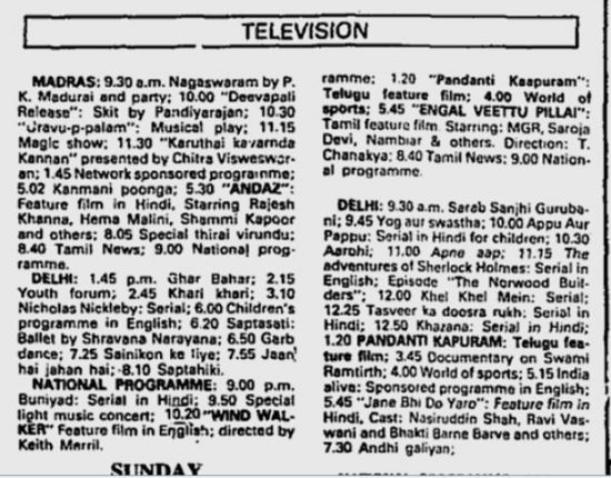 Further regional stations in Srinagar and Amritsar opened in 1973, followed by Calcutta, Madras and Lucknow in 1975, with a chain of relays extending the coverage of these to other parts of the country. Again, the content was mainly news, sports and locally-produced fare, with very little in the way of imported drama.