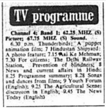 The Doordarshan television service was launched from Delhi in September 1959, albeit with a very rudimentary and limited transmission range. It wasn't until August 1965 that regular daily news broadcasts commenced.