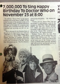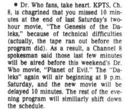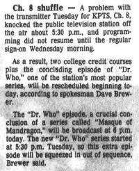 • 5 August 1985: The Jon Pertwee stories begin, weeknights at 6:00. Around this time, the Wichita station did a promotional commercial during its fundraisers. The trailer promoted the station's investment in the Tom Baker and William Hartnell/Patrick Troughton runs. They begin 13 September 1986.