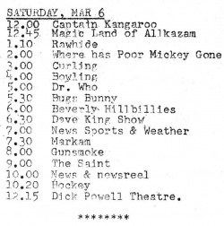 Saturday episodes ran to 10 April then switched to 5:30 PM Wednesdays on 28 April. The series finished in Flin Flon on Friday, 9 July 1965.
