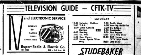 In all fairness to CFTK Terrace, this station had a short broadcast day with the station starting service at 1:00 PM on weekdays. The schedule permitted one hour of youth programming on weekdays which was filled with the very popular CBC programs of Razzle Dazzle and Music Hop.