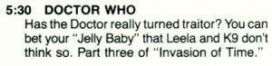 - 26 January-3 February 1983: The Talons of Weng-Chiang is replaced by The Invasion of Time (see letter below)