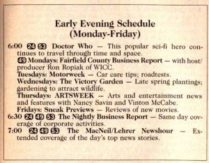 - 1 January 1985: The complete Jon Pertwee package begins, with repeats at 11pm.