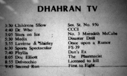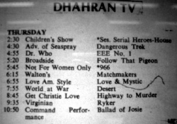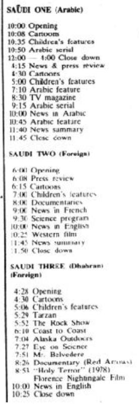 TV listings have been obtained from the Saudi newspaper Arab News (an English publication from Jeddah), and the Bahraini paper, the Gulf Mirror, which has full TV listings for most of the neighbouring Gulf countries (but no issues available prior to October 1977).
