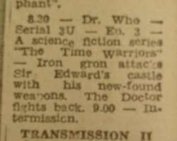 Some of the story titles are incorrect: Two episodes were billed as being "Part 3" of The Monster of Peladon, The Time Warrior was listed as "The Time Warriors" (plural) both years, and Pyramids of Mars was given in the singular. The billings also identify some of the episodes by their BBC production codes, such as "Dr Who - Series 3U – "The Time Warriors" both years, and "Dr Who Series 3Y – The Monster of Peladon" on all six in 1984.