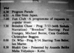 TV listings have been obtained from the Sri Lankan newspapers Ceylon Observer, Daily Observer, Daily News and Daily Mirror. Newspapers were checked for 1979 through to 1988, and the 1981 and 1984 runs of episodes were the only two found.