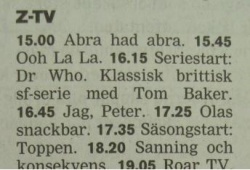 Print TV listings are from Dagens Nyheter. Although the billing from 24 August 1996 says "med Tom Baker", the first serial was the Jon Pertwee story, Planet of the Spiders. Interestingly, despite the listings being in Swedish, the story titles published were the familiar English ones, rather than the Swedish equivalents.