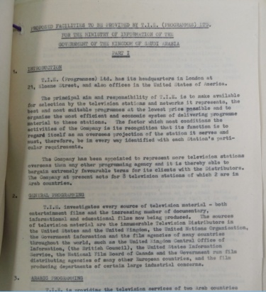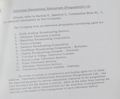 • The Company has been appointed to represent more television stations overseas than any other programme agency and it is thereby able to bargain extremely favourable terms for its client with the Distributors. The Company at present [i.e. by 1964] acts for 8 television stations of which 2 are in Arab countries. [i.e. Aden and Sudan]