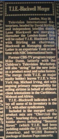 In May 1974, (and presumably as a direct result of it no longer having annual commission income from the stations it once has exclusive rights with) TIE Ltd merged with another London-based international TV distributor, Lane Blackwell Limited; the joint-venture becoming TIE-Blackwell Ltd. (The joint-venture was still based at the South Audley Street address.) But in February 1975, less than one year later, this co-venture came to an end. Lane Blackwell went back to distributing programmes on a solo basis.