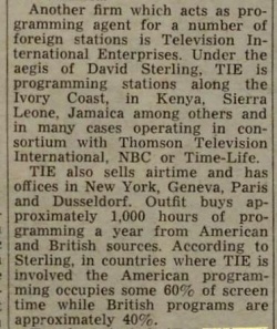 This was the subsidiary that specifically handled programme purchases and distribution, sometimes undertaking the audition process. As reported in Variety magazine of 26 February 1964 (see above right), TIE purchased thousands of hours of programming a year from American and British sources, of which some 60% was from the US, and the other 40% from Britain. (With programmes provided by ITV companies, the BBC and other programme makers.)