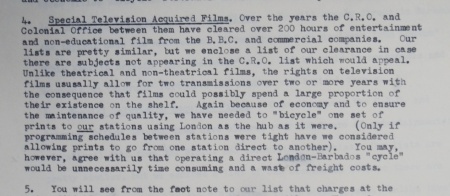 The company also dealt with such matters as insurance and checking the quality of film prints. As noted in this memo dated March 1964 [at right] relating to films being distributed to and from Barbados, for this particular batch of films, TIE had only one set of prints which were to be bicycled to its stations "using London as the hub". It's certain that this was so the London office could conduct quality checks on each film before being sent to the next destination, but it's clear from the last paragraph in this section of correspondence that from time to time when scheduling dictated otherwise and also from an economical angle, it was preferable to send films from country to country instead of using London as the intermediary.