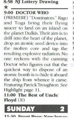 • The New Jersey Network was the first US station to screen Troughton episodes, starting from 1 February 1986: see TV listing above.