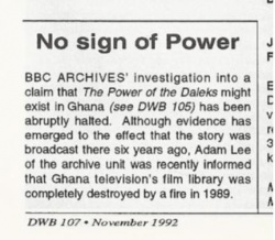 - In issue #105 of DWB (September 1992) it was reported that the six parter may have been shown in Ghana "six years ago..." (i.e. in 1986). Two issues later (#107, November 1992), they reported that the Ghana television film library had been completely destroyed by fire in 1989. Although the screening of that story turned out to be a hoax (the perpetrators had chosen Ghana as it was the most obscure place they could think of), the fire was an actual event, and TV news footage of the 23 May 1989 disaster can be seen HERE.