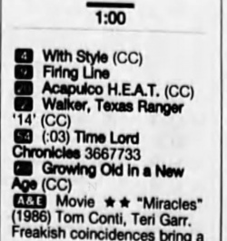 TV listings for KTEH Channel 54 have a one-hour programme called "Time Lord Chronicles" showing as a late night filler after the regular episode of Doctor Who on 1 March 1998, 15 November 1998 and 13 June 1999 (this screening was from 1am to 2am).