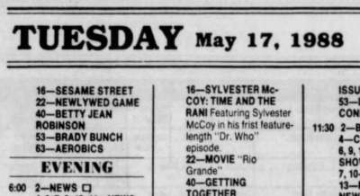 Sylvester McCoy's "frist" adventure, on WQEX; Pittsburgh Press, 15 May 1988