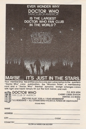- 21 March 1982, members from the DWFCA help raise funds for the KRMA PBS station. By June 1982 the club boasted 1,200 members. In three months, membership had climbed to 3,000 – making the club the largest Doctor Who fan organisation in the world. By February 1983, it claimed 7,500 members. The club enjoyed a special relationship with the BBC and Lionheart, and produced its own line of merchandise, including unlicensed t-shirts, badges and publications.