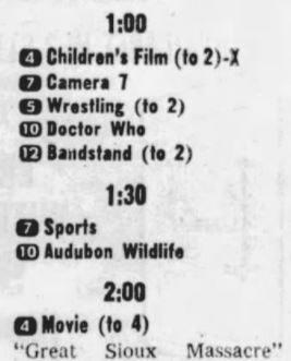 - 8 and 15 September 1973: Billings appear in the TV Guide and several Florida newspapers for these two Saturdays. The start time is given as 1pm, but the publications don't all agree on the end time - some say 1.30pm, but others have 2.00pm. No other billings can be found, despite WPLG appearing in BBC Records as one of the first stations to buy the initial package of 13 Jon Pertwee stories by November 1972. It's more than likely that WPLG did plan to show the series starting from 8 September, but those plans changed, and the 72 episode run was replaced at the last hour and never rescheduled.